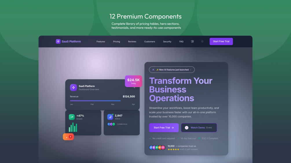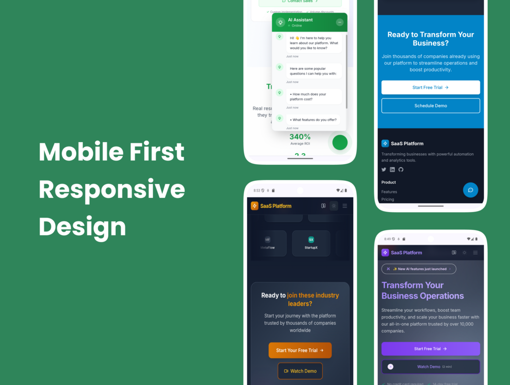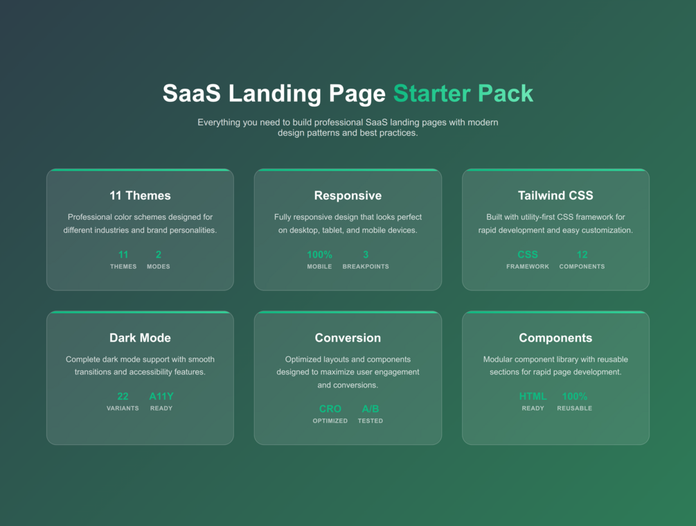 What You'll Get : 2 Complete Landing Pages (Main + Signup) 11 Professional Themes (Light + Dark Mode) 12 Modular HTML Components 100% Tailwind CSS - Mobile-First Responsive Design - JavaScript Theme Switcher - Complete Documentation - npm Build Tools Included - Bonus Features: Smart chat bot component (demo) - Scroll animations with Intersection Observer - Form validation with accessibility - SEO optimized structure